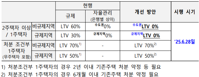 - 다주택자 주담대: 수도권·규제지역 내 주택을 2채 이상 보유한 차주가 추가 주택을 구입할 경우 주택담보대출을 전혀 받을 수 없게 됩니다 (LTV 0% 적용).