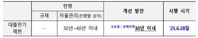 - 대출 만기: 수도권·규제지역 내 주담대 대출 만기는 30년 이내로 제한됩니다. (기존 30~40년 이내)