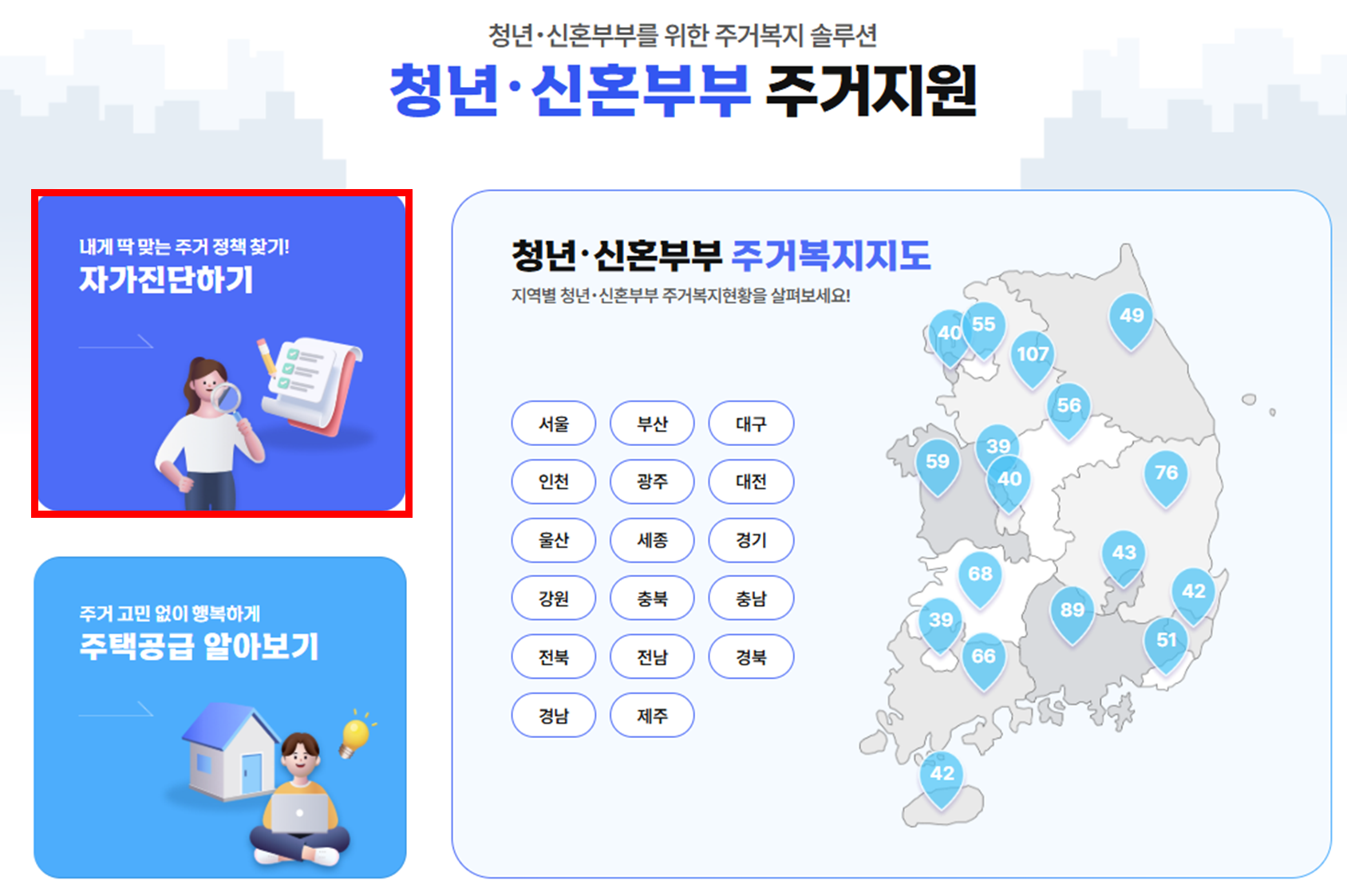 위와 같이 나오게 됩니다. 지도의 지역을 클릭하게 되면 해당 지역에서 시행하고 있는 정책들이 나옵니다! 여기서 내가 받을 수 있는 정책을 먼저 확인하는게 중요하기 때문에 자가진단하기를 클릭합니다!