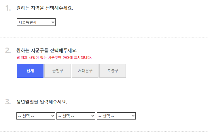 - 1번에서 선택한 시의 각 구마다 자체 사업이 있습니다. 만약 내가 거주하고 싶은 구가 강동구라면 전체로 선택하시면 됩니다!