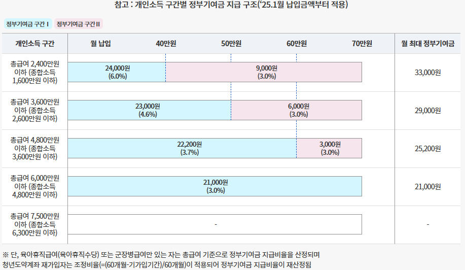 청년도약계좌의 가장 큰 혜택은 정부의 추가 적립금과 세제 지원입니다. 가입자가 매월 일정 금액을 납입하면, 정부가 매칭 방식으로 매월 최대 3만원 3천원까지 지원금을 추가 적립합니다. 이 지원금은 자산 형성을 크게 가속화하는 핵심 요소로, 특히 소득이 낮은 청년층에게 유리합니다. 예를 들어 5년 동안 매달 70만원을 납입하면, 정부 지원금과 이자를 합쳐 약 5,000만원 상당한 금액을 목돈으로 마련할 수 있습니다. 지원금은 소득별로 상이하며 아래와 같습니다.