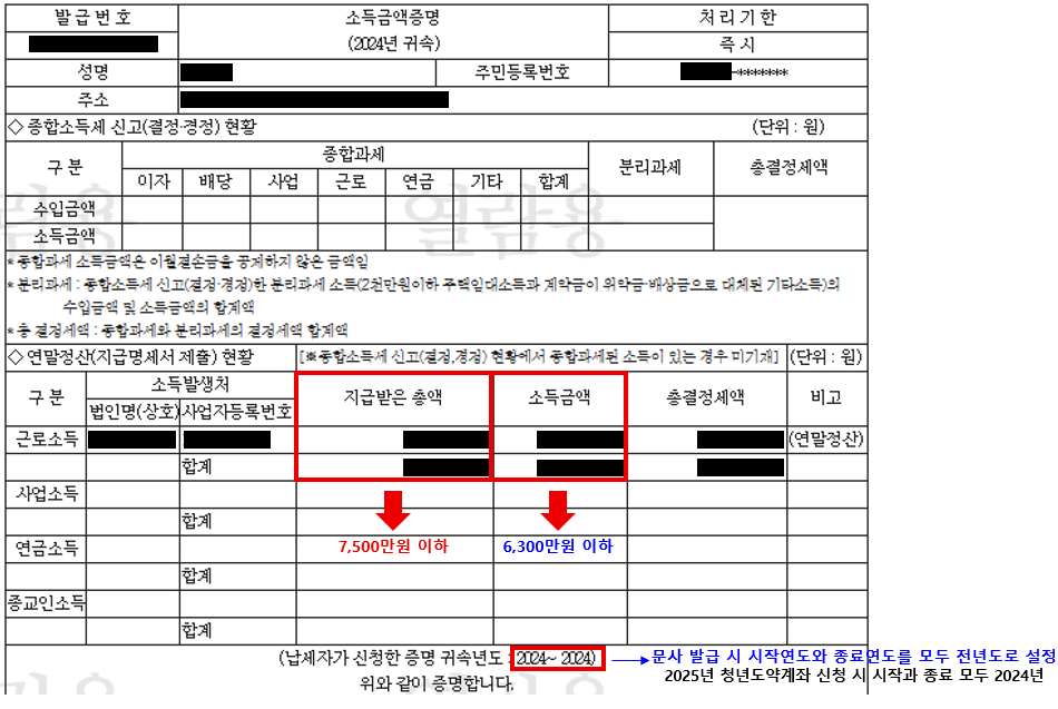 쉽게 말해, 근로 소득자인 경우 전년도 세전 총급여액(월급, 상여급 등 포함)이 7,500만원 이하이고, 종합소득금액이 6,300만원이하까지 신청가능합니다. 전년도 소득금액을 확인하는 가장 정확한 방법은 정부 24의 [소득금액증명 발급]을 통해 확인할 수 있습니다.
