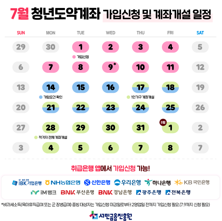 가입 신청은 매월 시중은행이나 인터넷뱅킹을 통해 간편하게 진행할 수 있습니다. 신청 후 약 2주 동안 서민금융진흥원에서 자격을 심사합니다. 이후 신청한 다음달 초에 계좌가 개설됩니다. 취급은행 통틀어 1명당 1개의 계좌만 가입 가능합니다. 또한, 현재 청년희망적금을 가입 유지하고 있는 경우 가입이 불가능합니다.