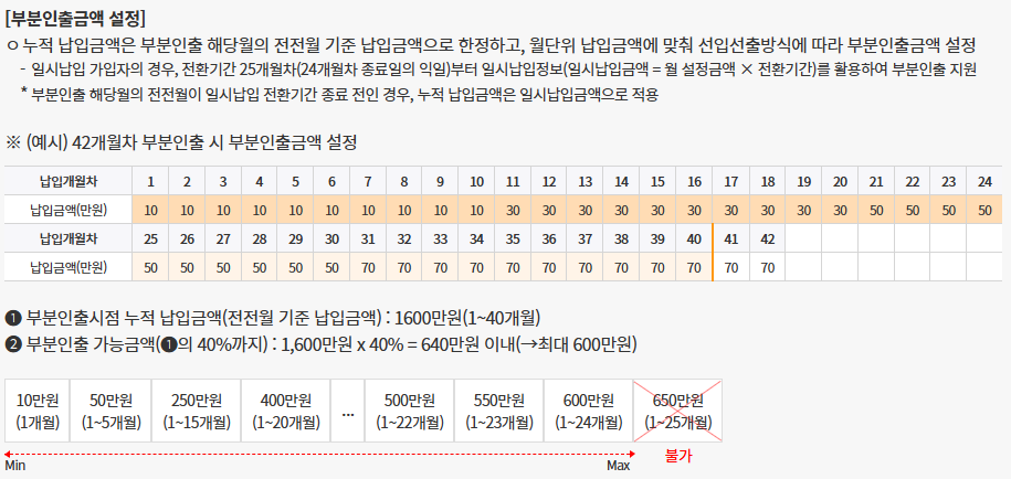 또한, 가입 후 2년 이상 유지한 경우 1회 한하여 해지 없이 부분 인출이 가능합니다. 누적 납입액의 최대 40% 이내에서 일부 금액을 인출할 수 있습니다. 다만, 부분인출한 금액에 대해선 중도해지 이율이 적용되고 이자소득세가 부과된다는 단점도 있습니다.